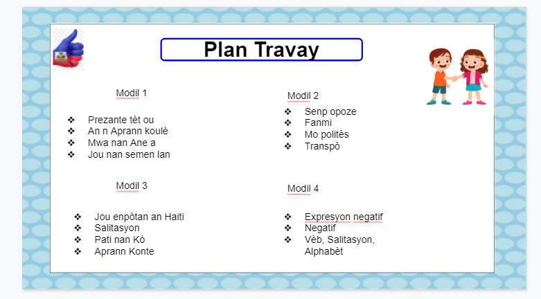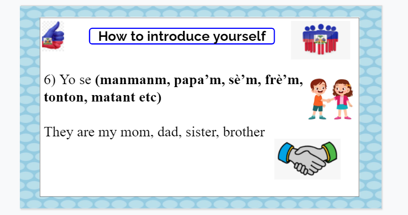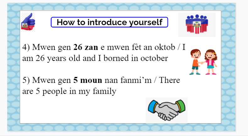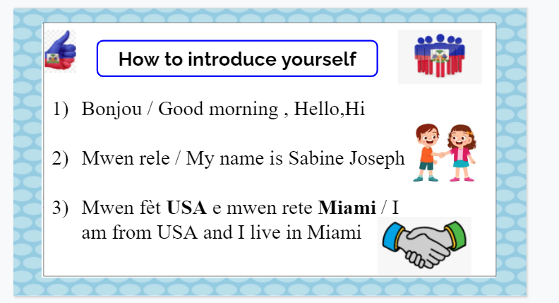 In this lesson the student will learn about presentation, specifically how to introduce themself in real life easily, after this lesson the student will be able to communicate basically with others in creole by presenting shortly themself.